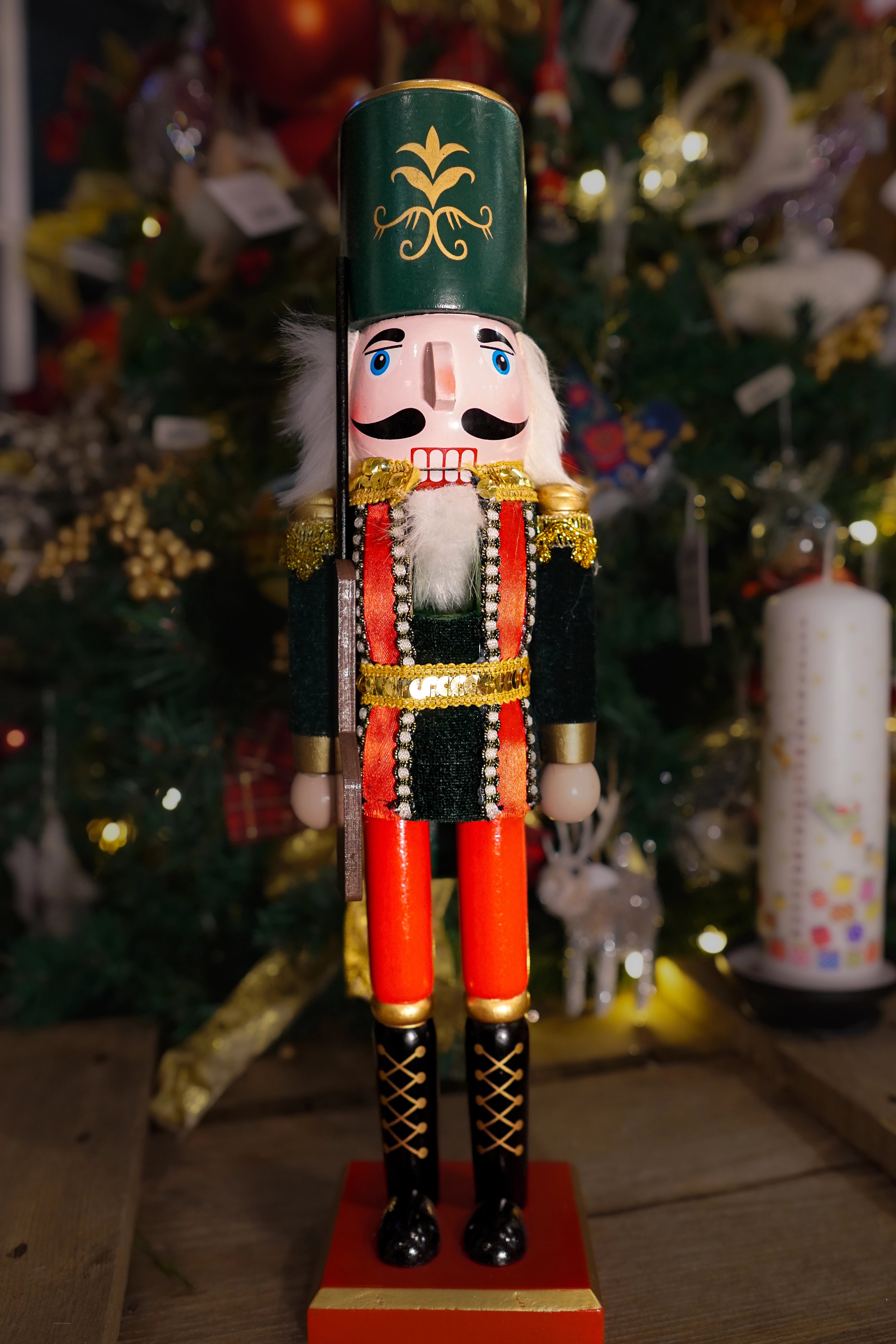 Large hand-painted Green Wooden Nutcracker Ornament by Gisela Graham. Standing proudly at 38cm tall, this impressive nutcracker is dressed in a beautifully detailed ceremonial soldier’s uniform, painted in rich shades of dark forest green, red and gleaming gold trims that catch the festive light.