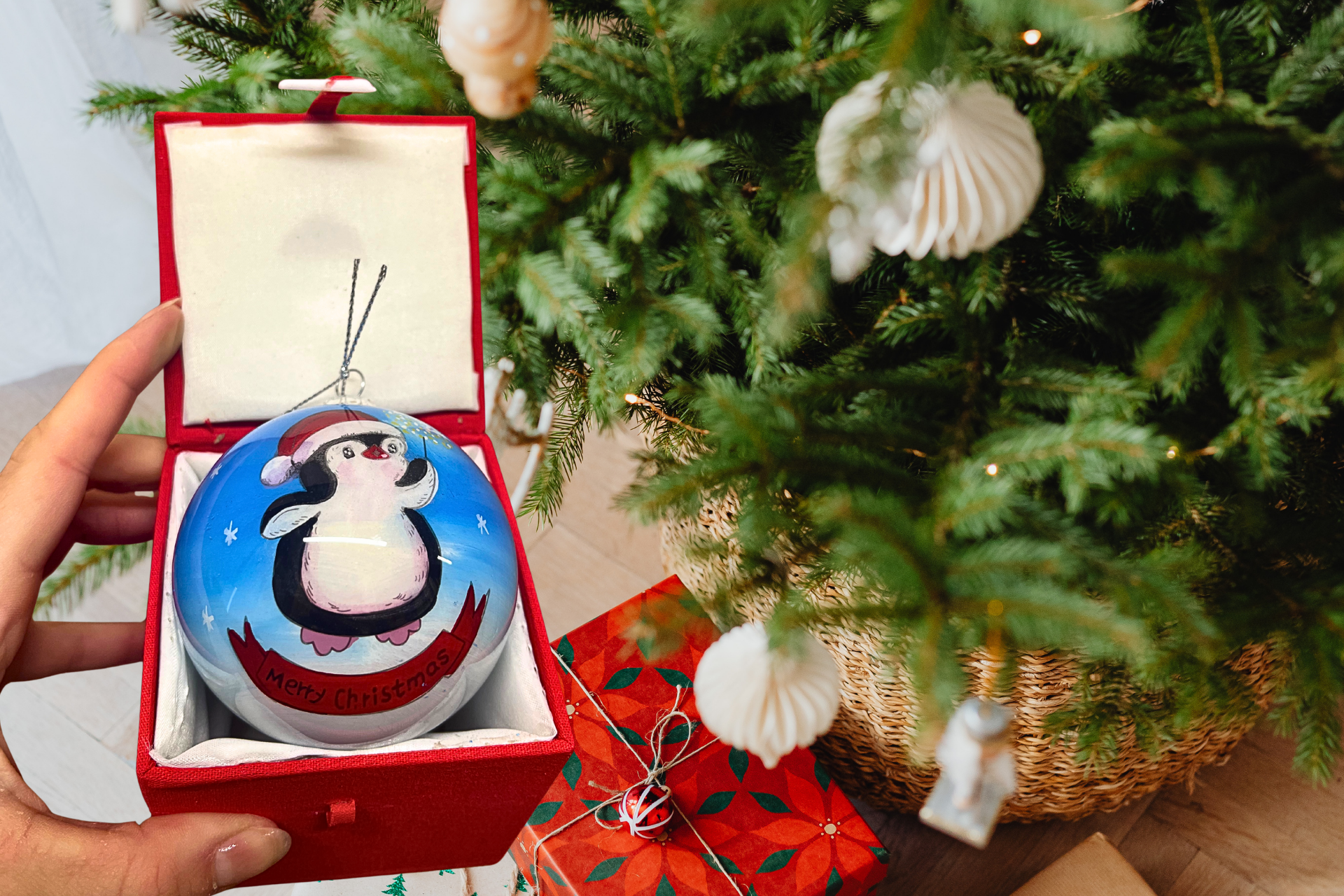 Celebrate the magic of the season with our Hand Painted Glass Bauble - Baby Penguin “Merry Christmas”. This adorable glass ornament features a sweet baby penguin surrounded by festive details and finished with a cheerful Merry Christmas message.