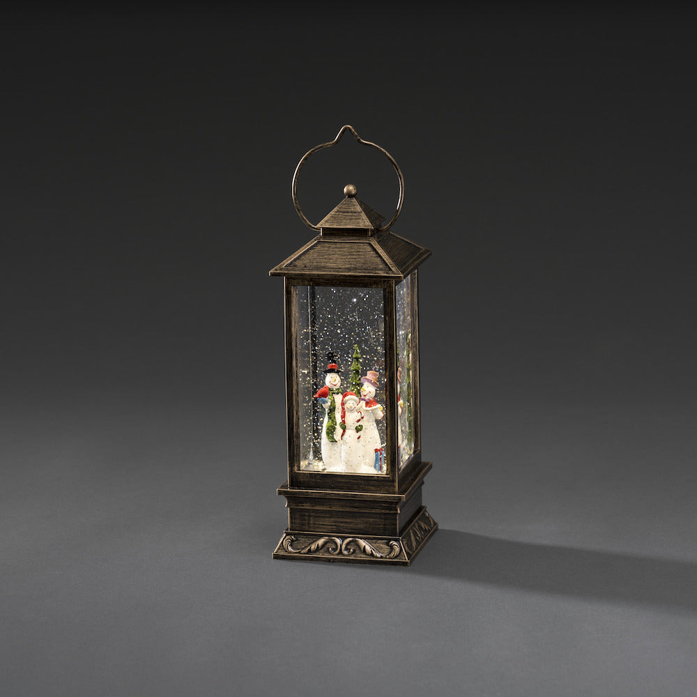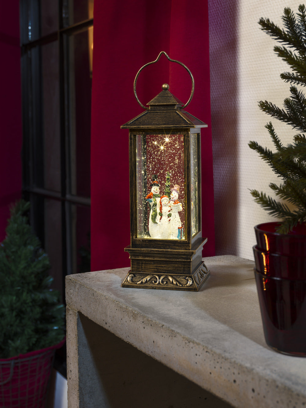 Water filled Christmas lantern featuring snowmen, 1 warm white LED light and built-in timer, perfect festive décor for Christmas, winter displays, and holiday home decoration
