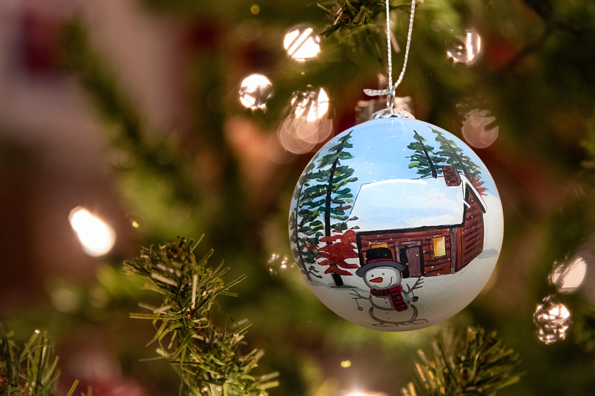Snowman and Deer Next to a Snowy Cabin – Winter Scene Ornament