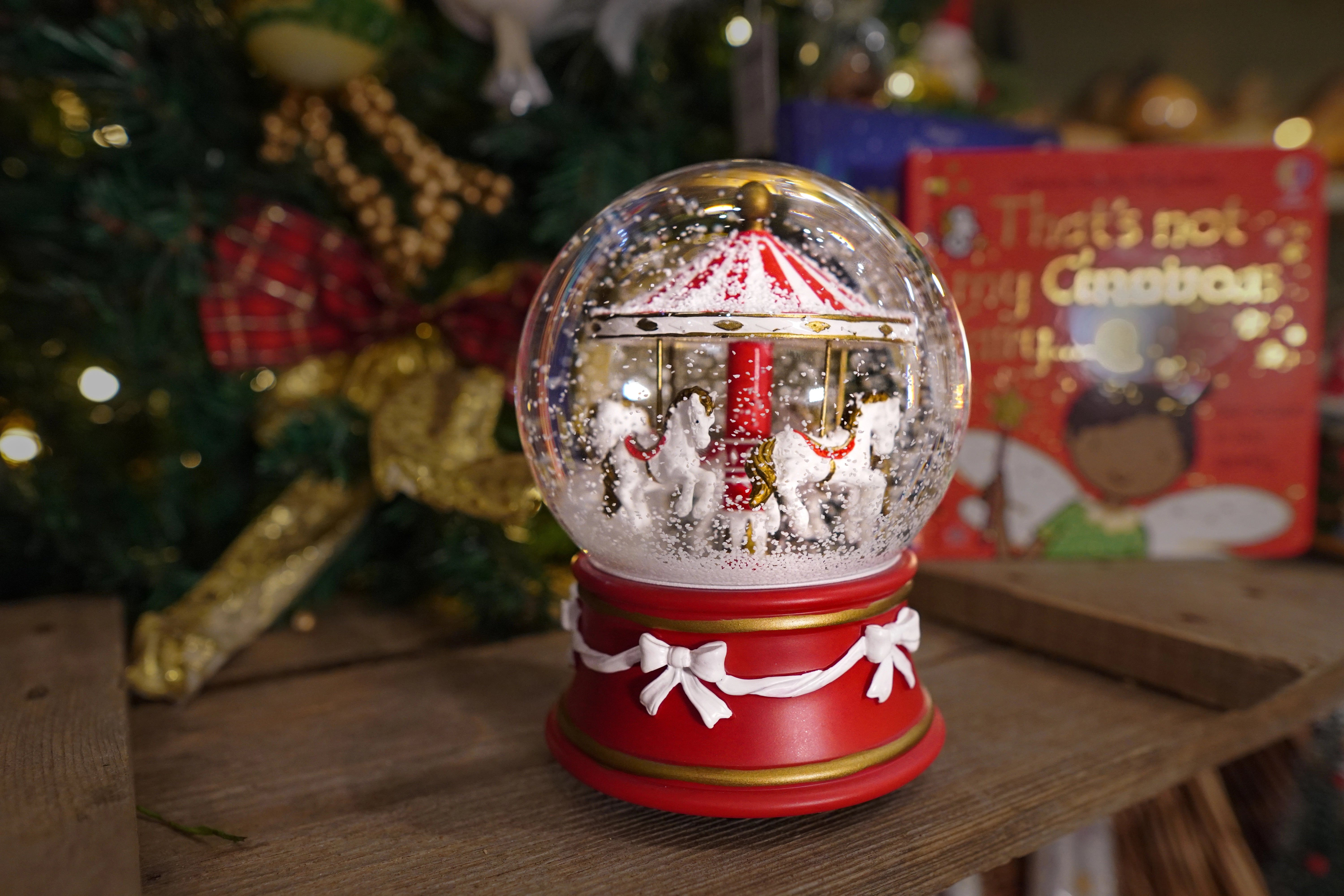 This glass globe sits a beautifully detailed miniature carousel, complete with elegant white horses, golden saddles and a traditional red-and-white canopy. When shaken, soft swirling snow drifts around the horses, creating a magical scene that glows beautifully under your Christmas lights.