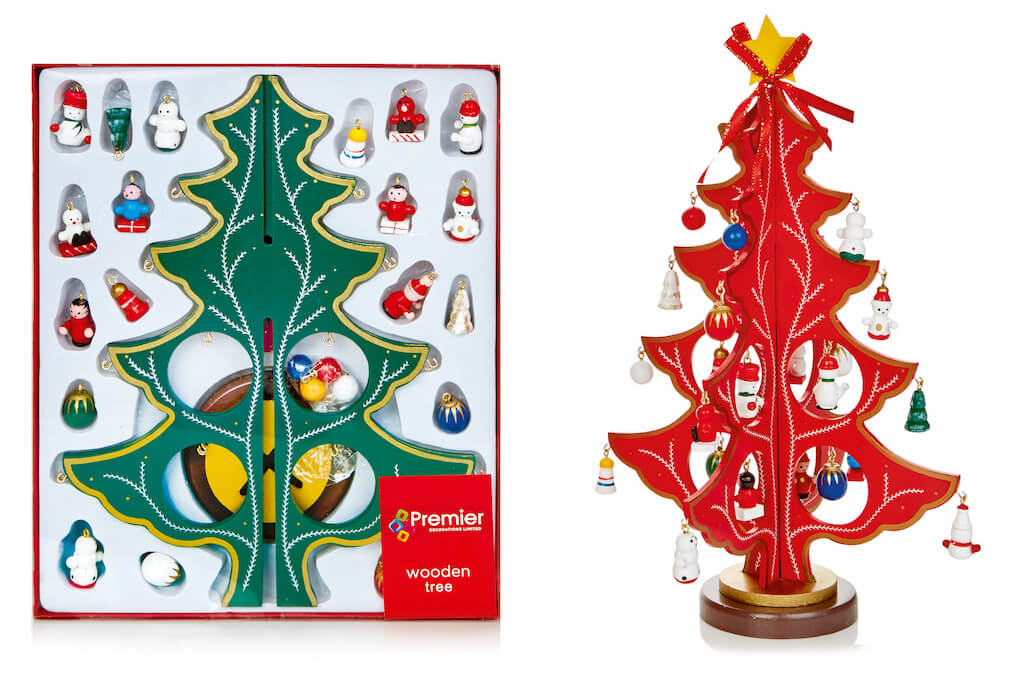 Available in red or green. This charming 4-sided wooden tree comes complete with 25 miniature hanging decorationsin assorted festive designs.